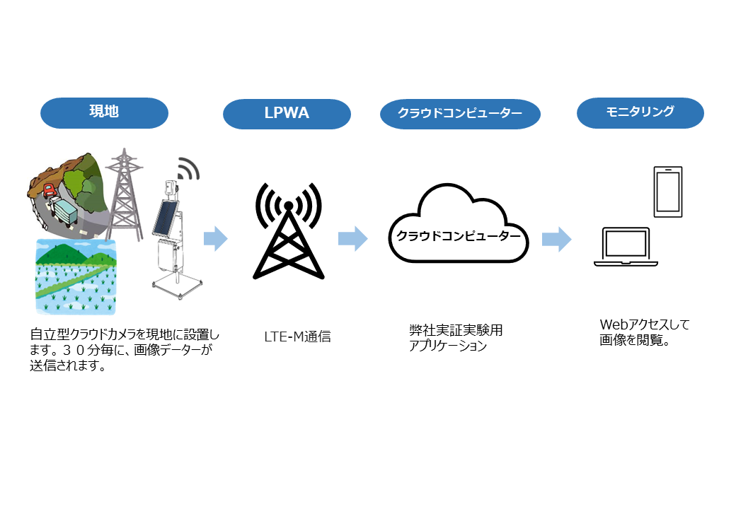 - 本自立型クラウドカメラ装置は、LPWA通信(LTE-M)を使っています。データー専用のローコストな回線ですので、維持費の負担が軽減されます。