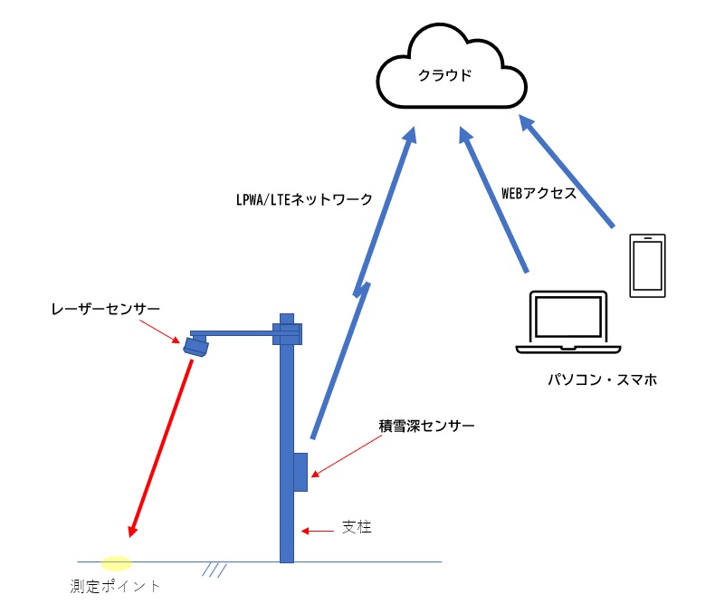 定期定期にLPWA(sigfox、LTE-M)経由で、クラウドコンピュータに送信。積雪深データを提供。